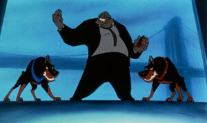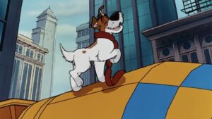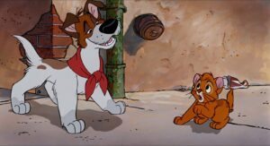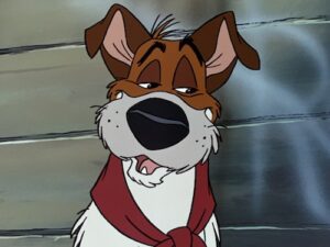 Roublard en premier lieu qui est un personnage assez cool et décontracté mais qui est tout de même ambivalent et imprévisible: il fait mine au début d’aider Oliver afin de dérober des saucisses à un vendeur et de se partager leur butin ensuite… Et une fois leur forfait accompli, il fait mine de ne pas se souvenir de la promesse qu’il a faite au chaton et lui fait faux bond !