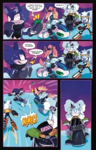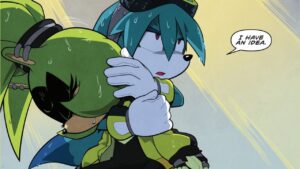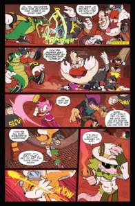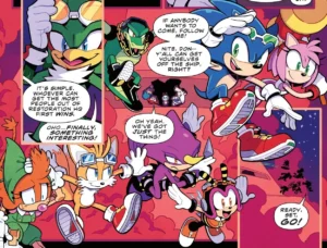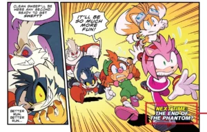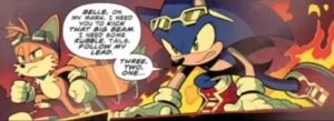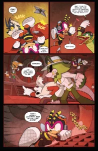 La seule petite réserve que j’aurai sur l’histoire est le fait que Tails et Amy fuient Rough et Tumble. En effet, Tails a déjà affronté Rough par le passé et l’a vaincu sans trop de difficultés, il est par conséquent étonnant qu’il se laisse à présent intimider par le sconse, car, bien que loin d’être inoffensif, le renardeau a déjà affronté et terrassé des ennemis autrement plus redoutables.
