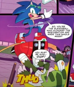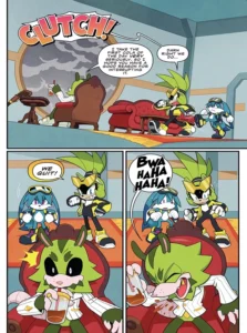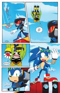 Sonic quant à lui se retrouve enfin face à face avec Clutch et l’empêche de prendre la poudre d’escampette afin que celui-ci réponde de ses crimes.