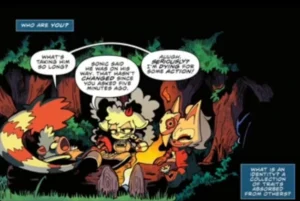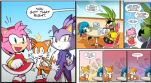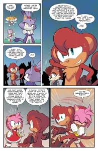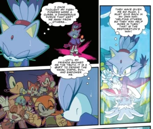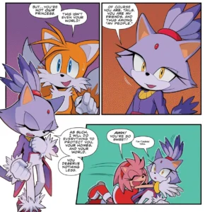 Les deux amis ont été heureux de revoir Tails et Amy et leur ont parlé des merveilleux pays qu’ils ont visité ces dernières semaines. Blaze toutefois s’en veut de ne pas avoir été là lors de la bataille et aurait tant aimé pouvoir aider tou(te)s ses ami(e)s ainsi que les habitants…