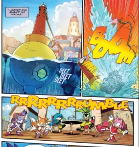 Amy et Tails sont quant à eux revenus sur l’ancien lieu du QG de la restauration qui a été complètement détruit par le vaisseau de Clutch et ne peuvent qu’assister dépités à l’ampleur des dégâts…