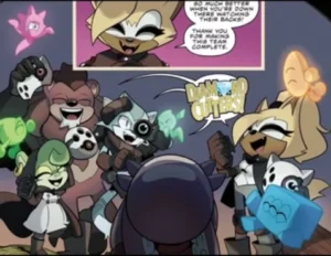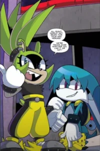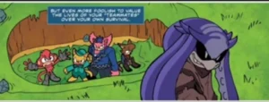 Néanmoins, ce qui cause la fureur de Surge (bien qu’elle « n’explose » pas devant le public) , c’est que si l’un d’entre eux les complimentent pour les avoir sauvé et estime même que Surge est rapide, son ami surenchérit en déclarant qu’elle n’est pas Sonic le hérisson.