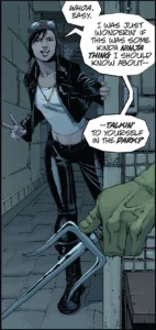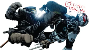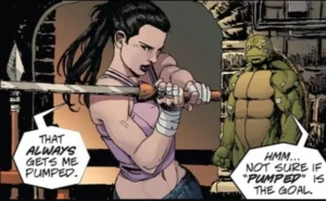 Ainsi dans un combat titanesque ayant opposé Raphaël à Karaï, celle-ci est tout de rouge vêtue et porte une tenue similaire à celle de Elektra, une kunoichi qui a été le plus grand amour de Matt Murdock alias Daredevil l’homme sans peur et elle a été créée par Frank Miller, grand auteur de comics que Kevin Eastman et Peter Laird admirent au plus haut point. Il faut dire qu’à la base, Les Tortues Ninja, bien qu’il soit originellement un comic book très sombre se voulait aussi un pastiche de Daredevil, l’organisation du clan Foot (« Pied » en anglais) étant un clin do’eil fait à l’organisation Ninja criminelle « La Main » dont fait partie Elektra.