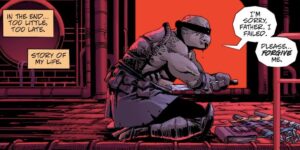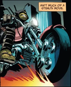 Avoir fait de lui un être sombre, meurtri par le décès de ses frères et de son maître et n’étant pas parvenu à surmonter son deuil était audacieux de la part de Tom Waltz et Kevin Eastman. Mais c’était néanmoins une bonne idée, si cela avait été Raphaël qui est le plus sanguin et susceptible des quatre frères ou bien Leonardo qui est le plus aguerri au combat aurait été une solution de facilité.