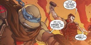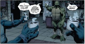 Qu’elle n’est pas sa surprise de se réveiller dans un endroit qui lui semble de prime abord familier ! Il reconnait la vieille femme qui le soigne qui n’est nul autre que sa meilleure amie April O’Neil et on découvre que notre Tortue Ninja est Michelangelo, le dernier survivant de sa fratrie !