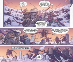 C’est ainsi que vit le jour sous sa forme définitive Teenage Mutant Ninja Turtles : The Last Ronin sous la forme d’une mini série composée de 5 chapitres, réunis plus tard au sein d’un seul album. Sa publication débuta en octobre 2020 et se conclut en avril 2022.